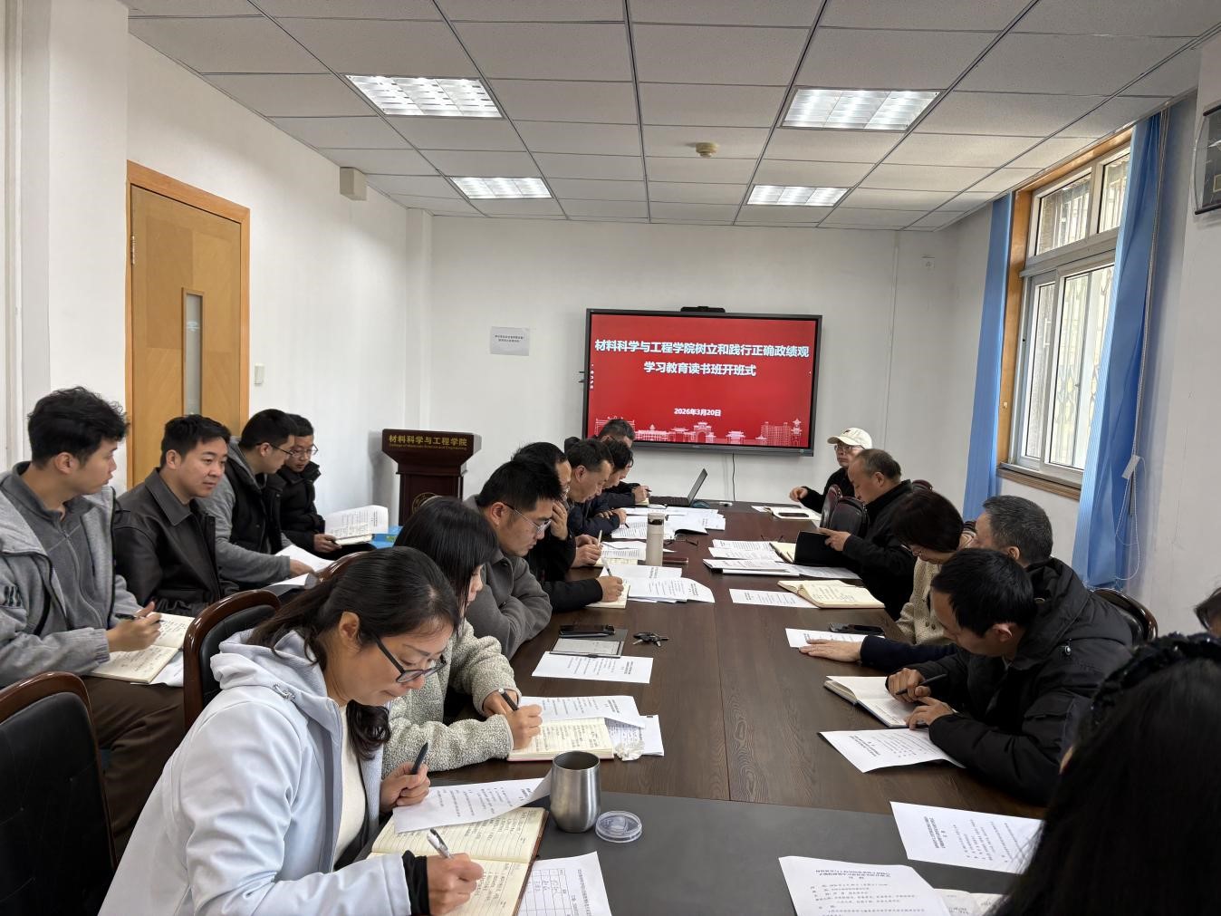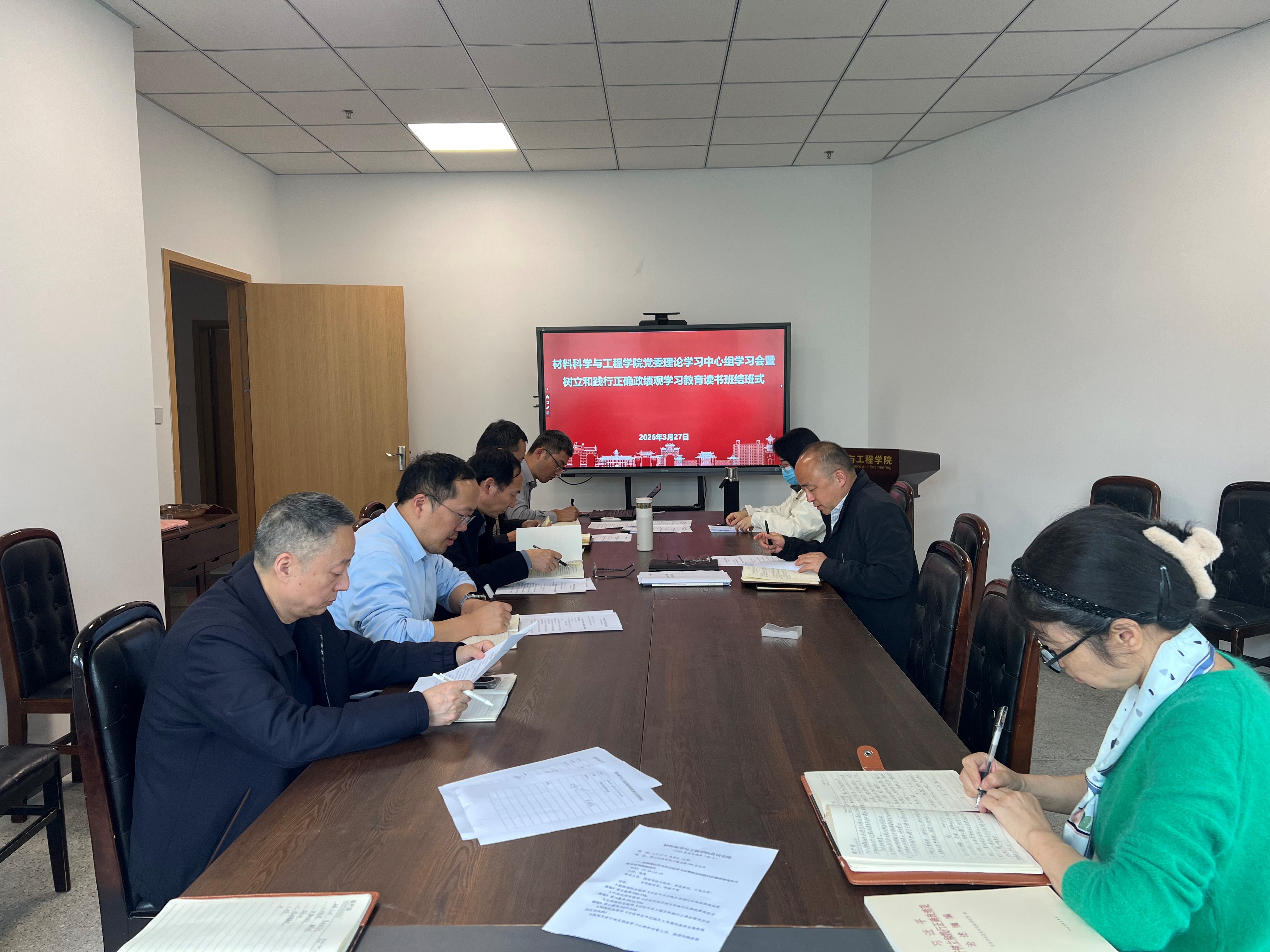 2026年3月20日至27日,材料科学与工程学院举办了树立和践行正确政绩观学习教育读书班。院党委书记邹勇主持学习会议,院领导班子成员、党委委员、工会主席、专职组织员、科级干部等全程参加,纪委委员、党支部书记等参加读书班开班式、专题研讨和结班式。